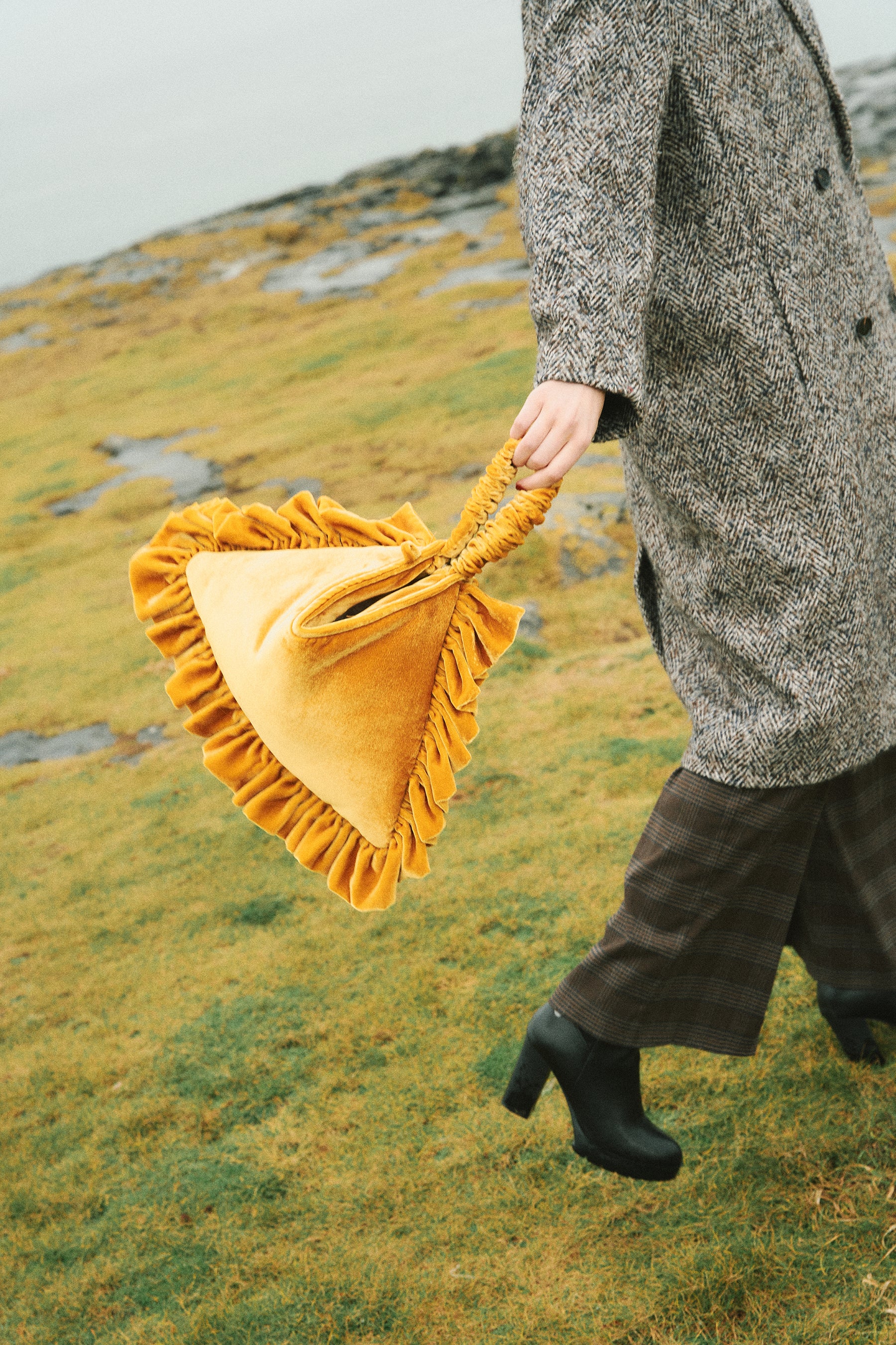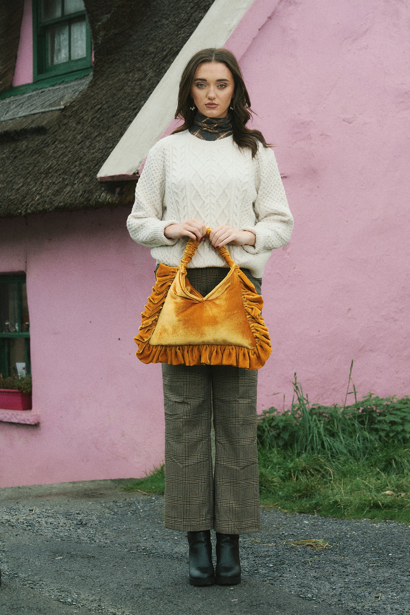 Elevate your look with this luxurious Gold Velvet bag designed for pure versatility. Its smart 2-in-1 closure lets you switch instantly between a chic clutch and a graceful handbag, two styles in one.